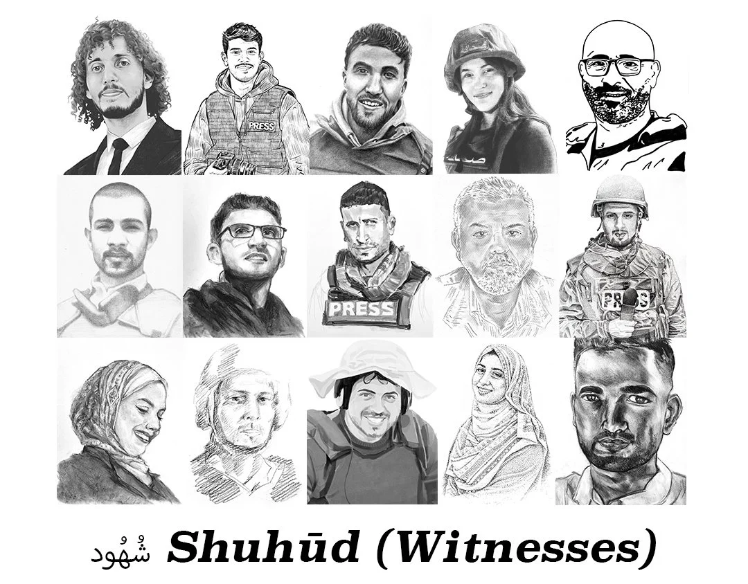 Shuhūd is a two-part project featuring an exhibition and fundraiser. This project transforms Monte Vista Projects into an immersive installation of portraits of journalists murdered by Israel. Participating artists include: Brett Park, Molly Segal, Kiara Machado, Chloe Hiu See Tsang, Michael Hambouz, and many more, who memorialize these journalists as both a political act and an attentive caretaking. Materialized into the physical realm, their faces will cover the walls of the gallery, turning the white cube into a confrontation with the scale of loss where one cannot look away. Through the creative act of portrait-making, artists are harnessing their personal arsenal of rebellion to create a counter-archive subverting dehumanizing power structures. Challenging systemic erasure and domination, Shuhūd investigates the cycles of injury and care, asking, "Why must the onus of repair fall onto those most affected?" Together, our offering is attention and remembrance: alchemized into action.