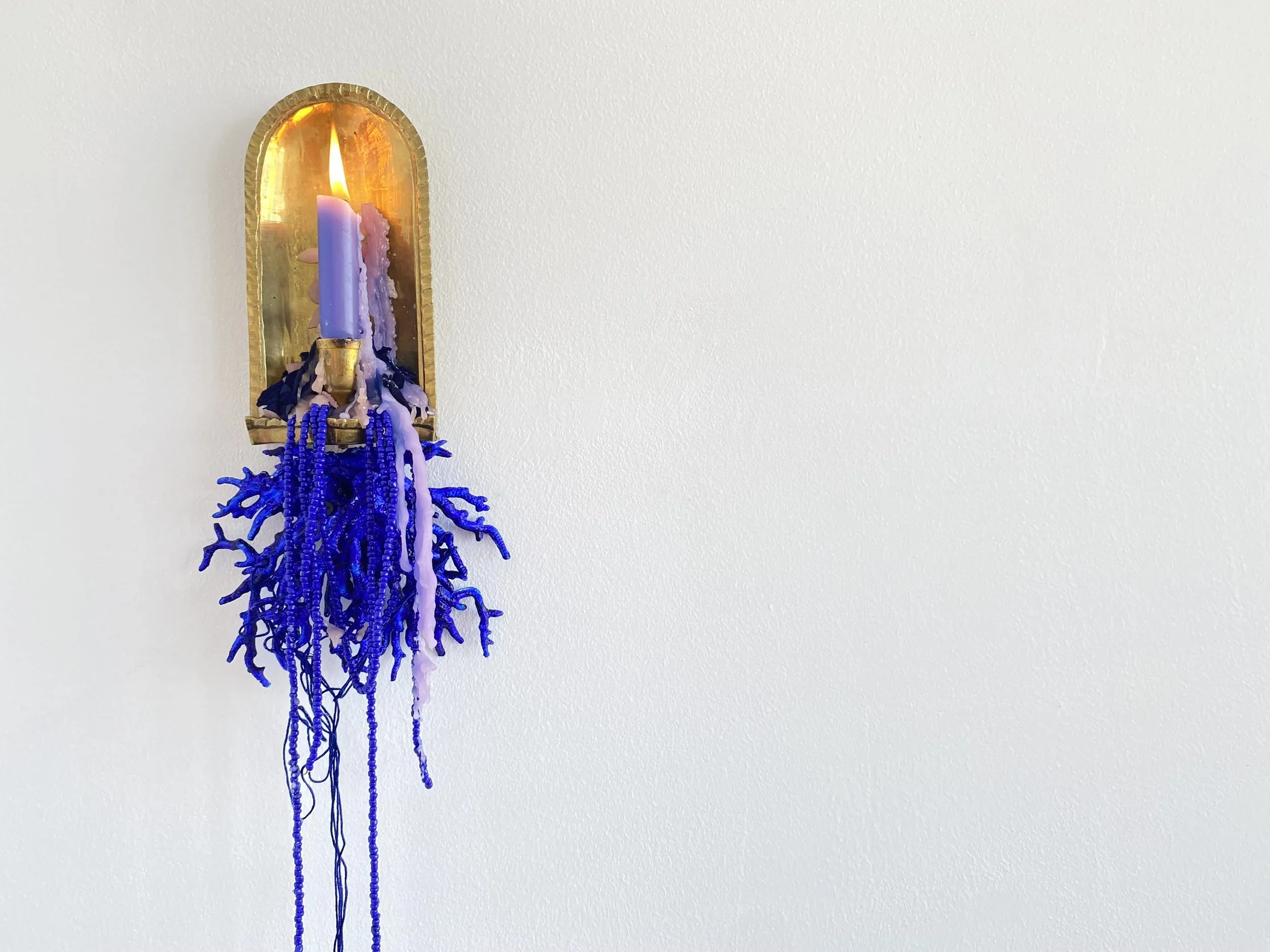A lit candle, quavering, stands in for time and the decreation of the artist. Small sculptures of found object assemblage, cast bronze, and bioplastic assert a visceral presence while evoking both reliquary and votive offering. Chimeric figures crowd the assembled paintings with anatomical, plant, and invertebrate elements such as antennae and coral. A golden halo crowns a figure resembling the Virgin Mary, whose torso is an inverted rendering of the cardiovascular system and whose face is bubbling with lichen. Working in acrylic and vinyl emulsion on canvas to produce these new icons, Oakley constructs sacred images of a collective future.